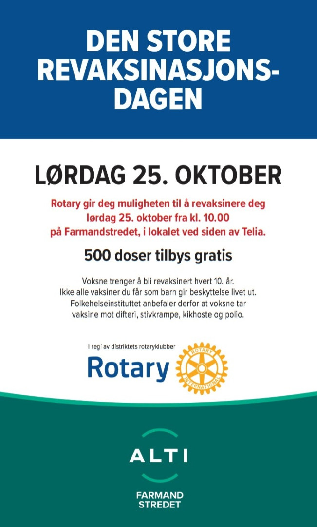 Klubbene i Vestfold 2 arrangerer Den Store Revaksinasjonsdagen arrangerers på Farmandstredet i Tønsberg (ALTI). Det åpnes for vaksinering denne lørdagen fra kl. 10.00.. Vaksineringen er GRATIS og alle kan komme.